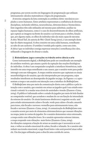 programas, por serem escrito em linguagens de programação que utilizam intensamente cálculos matemáticos e lógica de programação. A terceira categoria da lista contempla os artefatos eletro-mecânicos acoplados a seres humanos. Estes artefatos representam a confluência de diversas disciplinas, incluindo robótica, neurociências, eletromecânica e biomecânica. Este engenhos têm sido utilizados até mesmo para substituir, auxiliar ou reparar órgãos humanos, como é o caso do desenvolvimento de olhos artificiais, que captam as imagens na frente do usuário e as levam para o cérebro, função que, por alguma razão, os olhos do individuo não são mais capaz de executar. A obra ‘Mood Tail’, de autoria de Wei-Chieh Tseng (2010), é um exemplo deste tipo de objeto maquinal. A obra consiste em uma calda humana, semelhante ao rabo de um cachorro. O artefato é vestido pelo sujeito, como um cinto. A ideia é que os individuo consiga expressar emoções à semelhança dos cães, utilizando a linguagem de abanar a cauda. 2. BiobodyGame: jogos e emoções no trânsito entre ciência e arte