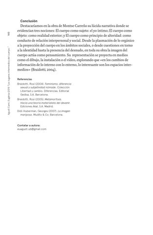 Destacaríamos en la obra de Montse Carreño su lúcida narrativa donde se evidencian tres nociones: El cuerpo como sujeto: el yo íntimo; El cuerpo como objeto: como realidad exterior; y El cuerpo como principio de alteridad: como conducto de relación interpersonal y social. Desde la plasmación de lo orgánico a la proyección del cuerpo en los ámbitos sociales, o desde cuestiones en torno a la identidad hasta la presencia del desnudo, en toda su obra la imagen del cuerpo actúa como pensamiento. Su representación se proyecta en medios como el dibujo, la instalación o el vídeo, explorando que «en los cambios de información de lo interno con lo externo, lo interesante son los espacios intermedios» (Braidotti, 2004). Referencias Braidotti, Rosi (2004). Feminismo, diferencia sexual y subjetividad nómade. Colección Libertad y cambio. Diferencias. Editorial Gedisa, S.A. Barcelona. Braidotti, Rosi (2005). Metamorfosis. Hacia una teoría materialista del devenir. Ediciones Akal, S.A. Madrid. Didi-Huberman, Georges (2007). La imagen mariposa. Mudito & Co. Barcelona.