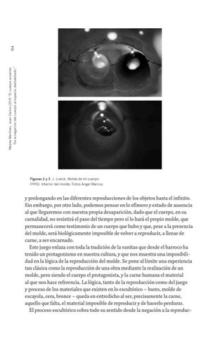 y prolongando en las diferentes reproducciones de los objetos hasta el infinito. Sin embargo, por otro lado, podemos pensar en lo efímero y estado de ausencia al que llegaremos con nuestra propia desaparición, dado que el cuerpo, en su carnalidad, no resistirá el paso del tiempo pero sí lo hará el propio molde, que permanecerá como testimonio de un cuerpo que hubo y que, pese a la presencia del molde, será biológicamente imposible de volver a reproducir, a llenar de carne, a ser encarnado. Este juego enlaza con toda la tradición de la vanitas que desde el barroco ha tenido un protagonismo en nuestra cultura, y que nos muestra una imposibilidad en la lógica de la reproducción del molde. Se pone al límite una experiencia tan clásica como la reproducción de una obra mediante la realización de un molde, pero siendo el cuerpo el protagonista, y la carne humana el material al que nos hace referencia. La lógica, tanto de la reproducción como del juego y proceso de los materiales que existen en lo escultórico – barro, molde de escayola, cera, bronce – queda en entredicho al ser, precisamente la carne, aquello que falta, el material imposible de reproducir y de hacerlo perdurar. El proceso escultórico cobra todo su sentido desde la negación a la reproduc-