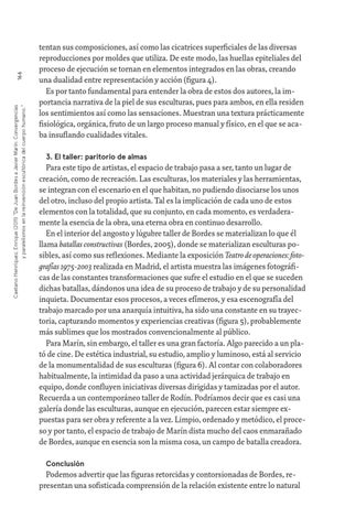 tentan sus composiciones, así como las cicatrices superficiales de las diversas reproducciones por moldes que utiliza. De este modo, las huellas epiteliales del proceso de ejecución se tornan en elementos integrados en las obras, creando una dualidad entre representación y acción (figura 4). Es por tanto fundamental para entender la obra de estos dos autores, la importancia narrativa de la piel de sus esculturas, pues para ambos, en ella residen los sentimientos así como las sensaciones. Muestran una textura prácticamente fisiológica, orgánica, fruto de un largo proceso manual y físico, en el que se acaba insuflando cualidades vitales. 3. El taller: paritorio de almas