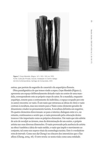 outras, que partem da sugestão do canavial e da arquetípica floresta. Obra paradigmática do que temos vindo a expor, Corpo Mandala (Figura 1), apresenta um espaço deliberadamente deixado vazio no centro de uma mandala, correspondente este ao próprio corpo do autor. Se a mandala, enquanto arquétipo, remete para o centramento do indivíduo, o espaço ocupado por este (o autor) encontra-se vazio. É um vazio que extravasa as ideias de cheio e vazio centrais à escultura, mas nos remete para o Vazio como elemento gerador de dinamismo criador no pensamento taoista. A escultura delimita um negativo. Os quatro elementos direccionam-se para o interior, dialogam entre si e, no entanto, continuamos a sentir que, o vazio provocado pela colocação destes troncos é tão importante como os próprios elementos. Um vazio que não advém do acto de esculpir as árvores, mas da determinação de um centro, o próprio artista nas suas diversas dimensões. O vazio provocado pela ausência do artista na obra é também a ideia do vazio médio, o vazio que impõe o movimento ao conjunto, tal como nos sopros vitais da cosmologia taoista. Este é o verdadeiro reino do intervalo. Como nos diz Cheng é no côncavo dos interstícios que o Tao aflora (Cheng, 2004: 16). O entre revela-se nesta visão como uma entidade.