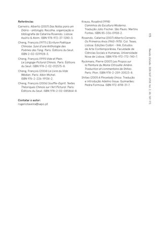Rosendo, Catarina (2007) Alberto Carneiro. Os Primeiros Anos (1963-1975). Col. Teses. Lisboa: Edições Colibri - IHA, Estudos de Arte Contemporânea, Faculdade de Ciências Sociais e Humanas, Universidade Nova de Lisboa. ISBN 978-972-772-740-7. Ryckmans, Pierre (2007) Les Propos sur la Peinture du Moine Citrouille-Amère. Traduction et commentaire de Shitao. Paris: Plon. ISBN 978-2-259-20523-8. Shitao (2001) A Pincelada Única. Tradução e introdução Adelino Ínsua. Guimarães: Pedra Formosa. ISBN 972-8118-31-7.