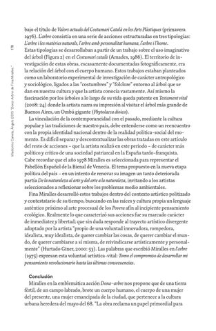 bajo el título de Valors actuals del Costumari Català en les Arts Plàstiques (primavera 1976). L’arbre consistía en una serie de acciones estructuradas en tres tipologías: L’arbre i les matèries naturals, l’arbre amb personalitat humana, l’arbre i l’home. Estas tipologías se desarrollaban a partir de un trabajo sobre el uso imaginativo del árbol (Figura 2) en el Costumari català (Amades, 1986). El territorio de investigación de estas obras, escasamente documentadas fotográficamente, era la relación del árbol con el cuerpo humano. Estos trabajos estaban planteados como un laboratorio experimental de investigación de carácter antropológico y sociológico, ligados a las “costumbres” y “folclore” entorno al árbol que se dan en nuestra cultura y que la artista conocía vastamente. Así mismo la fascinación por los árboles a lo largo de su vida queda patente en Testament vital (2008: 24) donde la artista narra su impresión al visitar el árbol más grande de Buenos Aires, un Ombú gigante (Phytolacca dioica). La vinculación de la contemporaneidad con el pasado, mediante la cultura popular y las tradiciones de nuestro país, debe entenderse como un reencuentro con la propia identidad nacional dentro de la realidad política-social del momento. Es difícil separar y descontextualizar las obras tratadas en este artículo del resto de acciones − que la artista realizó en este periodo − de carácter más político y crítico de una sociedad patriarcal en la España tardo-franquista. Cabe recordar que el año 1978 Miralles es seleccionada para representar el Pabellón Español de la Bienal de Venecia. El tema propuesto en la nueva etapa política del país − en un intento de renovar su imagen un tanto deteriorada partía De la naturaleza al arte y del arte a la naturaleza, invitando a los artistas seleccionados a reflexionar sobre los problemas medio ambientales. Fina Miralles desarrolló estos trabajos dentro del contexto artístico politizado y contestatario de su tiempo, buscando en las raíces y cultura propia un lenguaje auténtico próximo al arte procesual de los Povera afín al incipiente pensamiento ecológico. Realmente lo que caracterizó sus acciones fue su marcado carácter de inmediatez y libertad; que sin duda responde al trayecto artístico divergente adoptado por la artista “propio de una voluntad innovadora, rompedora, idealista, muy idealista, de querer cambiar las cosas, de querer cambiar el mundo, de querer cambiarse a sí misma, de reivindicarse artísticamente y personalmente” (Hurtado Giner, 2000: 53). Las palabras que escribió Miralles en l’arbre (1975) expresan esta voluntad artística-vital: Tomo el compromiso de desarrollar mi pensamiento revolucionario hasta las últimas consecuencias. Conclusión