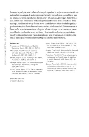 la mujer, aquel que tuvo en las culturas primigenias, la mujer como madre tierra, autosuficiente, capaz de autoengendrar, la mujer como figura cosmológica que no interviene en la explotación del planeta” (Parcerisas, 2001:39). Recordemos que justamente en los años 70 tuvo lugar la confluencia de las temáticas de la ecología y del feminismo, y fueron estos también unos años donde las preocupaciones ambientales cobraron importancia a nivel mundial. En este contexto Dona–arbre apuntaba cuestiones de gran relevancia, que en su momento pasaron diluidas por los discursos políticos y la situación del país; pero quizás en nuestros días cobran gran vigencia mediante una determinada reivindicación social-ecológica próxima al creciente pensamiento ecofeminista. Referencias Amades, Joan (1986). Costumari Català. Barcelona: Salvat. ISBN: 84-345-3673-0 AAVV(2001). Fina Miralles. De les idees a la vida. Sabadell: MAS, Museu d’Art de Sabadell. ISBN: 84-87221-49-1 Brosse Jacques (2001). Mythologie des arbres. Paris: Payot. ISBN: 2-228-88711-0 Fàbregas, Xàvier (1995). Les Arrels llegendàries de Catalunya. Barcelona: La Magrana. ISBN: 8474102987 Hurtado Giner, Agustí (2001) “De les idees a la vida” en Fina Miralles. De les idees a la vida. Sabadell: MAS, Museu d’Art de Sabadell Contactar a autora: aviladomiu@ub.edu