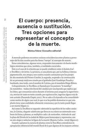 A menudo podemos encontrar curiosas coincidencias entre plantas y personajes de ficción creados para dar forma “cuerpo” al concepto de muerte. Estas coincidencias, algunas veces, responden únicamente a la faceta morfológica mientras que otras, también, a cualidades esenciales. Este es el caso de la relación que se puede establecer entre el Acónito Azul o Tora Blava y la Catrina. La primera, es una planta que, por su belleza y intensa pigmentación, nos atrapa y nos cautiva cuando caminamos por los parajes de alta montaña del Pirineo Catalán, la segunda, responde a la construcción de un personaje mejicano creado por el grabador José Guadalupe Posada y bautizado, mas tarde, con el nombre de Catrina, por el muralista Diego Ribera. Coloquialmente, la Tora Blava, es llamada por los pastores “la matallops” (la matalobos - traducción literal del catalán) por una leyenda que explica que los lobos, que consumían raíces durante el invierno para asegurar la supervivencia, morían de tanto en tanto cuando, por equivocación, ingerían alguna raíz de este acónito (Panareda Clopés, 2011). No se sabe si la leyenda se ha consolidado como motivo de algún caso real, lo que si se ha podido demostrar es que esta planta tiene unas cualidades altamente venenosas y por lo tanto puede llegar a ser mortal (figura 1). Así como la Tora Blava se expande cubriendo la superficie de los valles catalanes, la Catrina, elegante aristócrata que lleva en su cráneo un extremado sombrero de frutas y plumas, se multiplica cada 1 de noviembre, vistiendo de azul la plaza del Zócalo de la ciudad de Méjico para homenajear y representar, con un aire alegre y seductor, la figura de la muerte (Reyero, Carlos, 2005) (figura 2). Cuando captamos la esencia de plantas como la Tora Blava entendemos la apropiación referencial del mundo floral de la que algunos de los mejores artistas