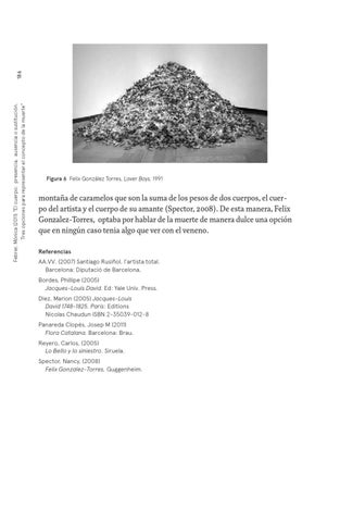 montaña de caramelos que son la suma de los pesos de dos cuerpos, el cuerpo del artista y el cuerpo de su amante (Spector, 2008). De esta manera, Felix Gonzalez-Torres, optaba por hablar de la muerte de manera dulce una opción que en ningún caso tenia algo que ver con el veneno. Referencias AA.VV. (2007) Santiago Rusiñol, l’artista total. Barcelona: Diputació de Barcelona, Bordes, Phillipe (2005) Jacques-Louis David. Ed: Yale Univ. Press. Diez, Marion (2005) Jacques-Louis David 1748-1825. Paris: Editions Nicolas Chaudun ISBN 2-35039-012-8 Panareda Clopés, Josep M (2011) Flora Catalana. Barcelona: Brau. Reyero, Carlos, (2005) Lo Bello y lo siniestro. Siruela. Spector, Nancy, (2008) Felix Gonzalez-Torres, Guggenheim.
