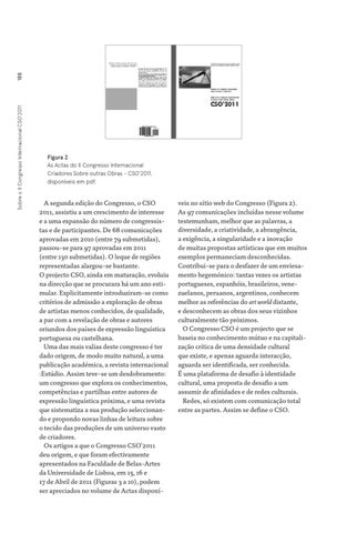 veis no sítio web do Congresso (Figura 2). As 97 comunicações incluídas nesse volume testemunham, melhor que as palavras, a diversidade, a criatividade, a abrangência, a exigência, a singularidade e a inovação de muitas propostas artísticas que em muitos exemplos permaneciam desconhecidas. Contribui-se para o desfazer de um enviesamento hegemónico: tantas vezes os artistas portugueses, espanhóis, brasileiros, venezuelanos, peruanos, argentinos, conhecem melhor as referências do art world distante, e desconhecem as obras dos seus vizinhos culturalmente tão próximos. O Congresso CSO é um projecto que se baseia no conhecimento mútuo e na capitalização crítica de uma densidade cultural que existe, e apenas aguarda interacção, aguarda ser identificada, ser conhecida. É uma plataforma de desafio à identidade cultural, uma proposta de desafio a um assumir de afinidades e de redes culturais. Redes, só existem com comunicação total entre as partes. Assim se define o CSO.