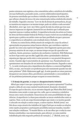 pantes retornem com registros, e/ou comentários sobre a existência do trabalho em suas habitações, passando assim, a serem colaboradores/participantes. As pessoas convidadas que recebem o trabalho são próximas da artista, fato que reforça o desejo da troca e de uma comunicação mútua estabelecida através do trabalho. Segundo a mesma: “Leve-me diz do desejo de permanência, do que se mantém em suspenso e ao mesmo tempo, pode ser refeito a cada encontro” (Rochefort, 2010: 59). Leve-me é feito a partir da mão da artista que tem suas marcas impressas no alginato (material de uso dentário que é utilizado para imprimir marcas e realizar moldes). A experiência docente da artista no Centro de Artes da Universidade Federal de Pelotas é marca visível em seu trabalho que aponta para a prática em atelier como um fazer partilhado em que o processo e a experiência se sobrepõem a um resultado único e fechado. A forma ou contra forma obtida através de vestígios do corpo da artista é apresentada em pequenas caixas brancas abertas, que convidam o sujeito a guardá-las como uma espécie de fragmento. Este fragmento aponta para uma presença anterior de um corpo, ao mesmo tempo em que dá a perceber sua ausência. Assim, presença e ausência são oscilantes e instáveis. Didi Huberman no livro O que vemos o que nos olha (1998) fala sobre a proximidade e distância expostas por algo que oscila entre o estar presente e o seu possível desaparecimento. Guardar algo é uma tentativa de aproximar-nos. Paradoxalmente nos aproximamos em situações de um iminente desaparecimento. Segundo o autor: “[...] a noite revela para nós a importância dos objetos e a essencial fragilidade deles, ou seja , sua vocação a se perderem para nós exatamente quando nos são mais próximos” (Didi-Huberman,1998: 99). A noite quando as coisas parecem desaparecer aos nossos olhos, percebemos a proximidade e a necessidade de vê-las próximas justamente porque escapam ao nosso domínio.