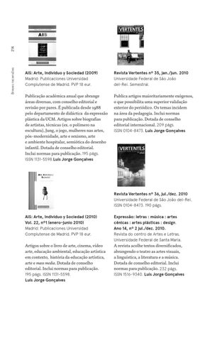 Revista Vertentes nº 36, jul./dez. 2010 Universidade Federal de São João del-Rei. ISSN 0104-8473. 190 págs. AIS: Arte, Individuo y Sociedad (2010) Vol. 22, nº1 (enero-junio 2010) Madrid: Publicaciones Universidad Complutense de Madrid. PVP 18 eur.