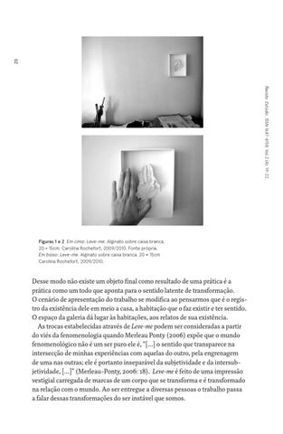Desse modo não existe um objeto final como resultado de uma prática é a prática como um todo que aponta para o sentido latente de transformação. O cenário de apresentação do trabalho se modifica ao pensarmos que é o registro da existência dele em meio a casa, a habitação que o faz existir e ter sentido. O espaço da galeria dá lugar às habitações, aos relatos de sua existência. As trocas estabelecidas através de Leve-me podem ser consideradas a partir do viés da fenomenologia quando Merleau Ponty (2006) expõe que o mundo fenomenológico não é um ser puro ele é, “[...] o sentido que transparece na intersecção de minhas experiências com aquelas do outro, pela engrenagem de uma nas outras; ele é portanto inseparável da subjetividade e da intersubjetividade, [...]” (Merleau-Ponty, 2006: 18). Leve-me é feito de uma impressão vestigial carregada de marcas de um corpo que se transforma e é transformado na relação com o mundo. Ao ser entregue a diversas pessoas o trabalho passa a falar dessas transformações do ser instável que somos.