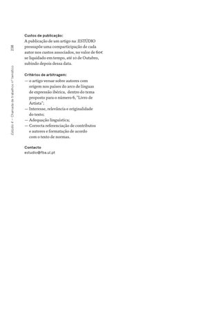 — o artigo versar sobre autores com origem nos países do arco de línguas de expressão ibérica, dentro do tema proposto para o número 6, "Livro de Artista"; — Interesse, relevância e originalidade do texto; — Adequação linguística; — Correcta referenciação de contributos e autores e formatação de acordo com o texto de normas. Contacto estudio@fba.ul.pt