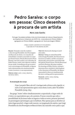 of an author. Taking as central thread the work of Luigi Pirandello, Six Characters in Search of an Author, and the concepts of theatricality and narrative associated with the body by Daniel Arasse, Nicolas Bourriaud and Pierre Restany, this paper analyzes five drawings of Pedro Saraiva, aiming to determine how, similarly to what happens to the characters of Pirandello, the figures represented in them are simultaneously the text to writing and its representation. Abstract