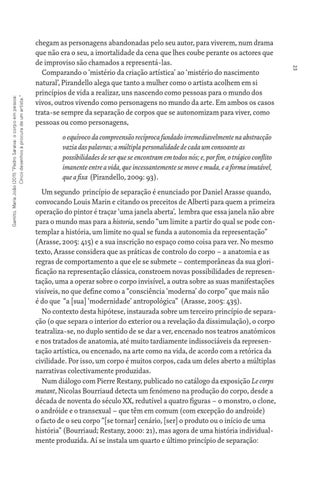 o equívoco da compreensão recíproca fundado irremediavelmente na abstracção vazia das palavras; a múltipla personalidade de cada um consoante as possibilidades de ser que se encontram em todos nós; e, por fim, o trágico conflito imanente entre a vida, que incessantemente se move e muda, e a forma imutável, que a fixa (Pirandello, 2009: 93). Um segundo princípio de separação é enunciado por Daniel Arasse quando, convocando Louis Marin e citando os preceitos de Alberti para quem a primeira operação do pintor é traçar ‘uma janela aberta’, lembra que essa janela não abre para o mundo mas para a historia, sendo “um limite a partir do qual se pode contemplar a história, um limite no qual se funda a autonomia da representação” (Arasse, 2005: 415) e a sua inscrição no espaço como coisa para ver. No mesmo texto, Arasse considera que as práticas de controlo do corpo – a anatomia e as regras de comportamento a que ele se submete – contemporâneas da sua glorificação na representação clássica, constroem novas possibilidades de representação, uma a operar sobre o corpo invisível, a outra sobre as suas manifestações visíveis, no que define como a “consciência ‘moderna’ do corpo” que mais não é do que “a [sua] ‘modernidade’ antropológica” (Arasse, 2005: 435). No contexto desta hipótese, instaurada sobre um terceiro princípio de separação (o que separa o interior do exterior ou a revelação da dissimulação), o corpo teatraliza-se, no duplo sentido de se dar a ver, encenado nos teatros anatómicos e nos tratados de anatomia, até muito tardiamente indissociáveis da representação artística, ou encenado, na arte como na vida, de acordo com a retórica da civilidade. Por isso, um corpo é muitos corpos, cada um deles aberto a múltiplas narrativas colectivamente produzidas. Num diálogo com Pierre Restany, publicado no catálogo da exposição Le corps mutant, Nicolas Bourriaud detecta um fenómeno na produção do corpo, desde a década de noventa do século XX, redutível a quatro figuras – o monstro, o clone, o andróide e o transexual – que têm em comum (com excepção do androide) o facto de o seu corpo “[se tornar] cenário, [ser] o produto ou o início de uma história” (Bourriaud; Restany, 2000: 21), mas agora de uma história individualmente produzida. Aí se instala um quarto e último princípio de separação: