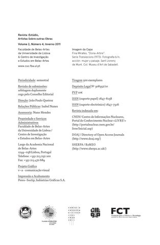 Direção: João Paulo Queiroz Relações Públicas: Isabel Nunes Assessoria: Nuno Mendes Propriedade e Serviços Administrativos Faculdade de Belas-Artes da Universidade de Lisboa / Centro de Investigação e Estudos em Belas-Artes Largo da Academia Nacional de Belas-Artes 1249–058 Lisboa, Portugal Telefone: +351 213 252 100 Fax: +351 213 470 689 Projeto Gráfico v–a · comunicação visual Impressão e Acabamento Peres–Soctip, Indústrias Gráficas S.A.