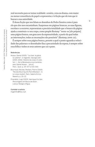 Referências Arasse, Daniel (2005). “La chair, la grâce, le sublime”, in Vigarello, Georges (dir.) (2005-2006). Histoire du corps (3 vols), Vol. I – De la Renaissance aux lumières, avec Daniel Arasse … [et al.]. Paris : Seuil, p. 411-477 e 533-540. Bourriaud, Nicolas; Restany, Pierre (2000). “Nicolas Bourriaud & PierreRestany”, in Le corps mutant. Paris: Galerie Enrico Navarra, p. 20-23. Pirandello, Luigi (2009). Henrique IV e Seis Personagens em Busca de Autor. Lisboa: Relógio d’Água. Contatar a autora: mjgamito@fba.ul.pt