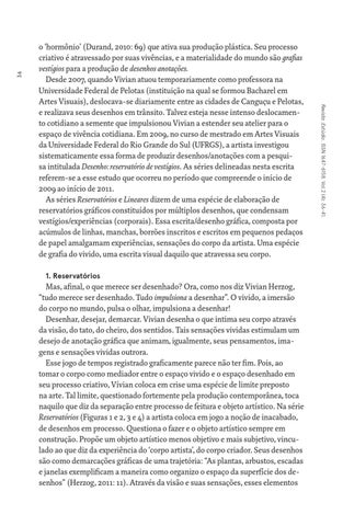 o ‘hormônio’ (Durand, 2010: 69) que ativa sua produção plástica. Seu processo criativo é atravessado por suas vivências, e a materialidade do mundo são grafias vestígios para a produção de desenhos anotações. Desde 2007, quando Vivian atuou temporariamente como professora na Universidade Federal de Pelotas (instituição na qual se formou Bacharel em Artes Visuais), deslocava-se diariamente entre as cidades de Canguçu e Pelotas, e realizava seus desenhos em trânsito. Talvez esteja nesse intenso deslocamento cotidiano a semente que impulsionou Vivian a estender seu atelier para o espaço de vivência cotidiana. Em 2009, no curso de mestrado em Artes Visuais da Universidade Federal do Rio Grande do Sul (UFRGS), a artista investigou sistematicamente essa forma de produzir desenhos/anotações com a pesquisa intitulada Desenho: reservatório de vestígios. As séries delineadas nesta escrita referem-se a esse estudo que ocorreu no período que compreende o início de 2009 ao início de 2011. As séries Reservatórios e Lineares dizem de uma espécie de elaboração de reservatórios gráficos constituídos por múltiplos desenhos, que condensam vestígios/experiências (corporais). Essa escrita/desenho gráfica, composta por acúmulos de linhas, manchas, borrões inscritos e escritos em pequenos pedaços de papel amalgamam experiências, sensações do corpo da artista. Uma espécie de grafia do vivido, uma escrita visual daquilo que atravessa seu corpo.