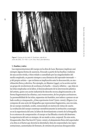 Las representaciones del cuerpo en la obra de Lara-Barranco implican casi siempre alguna forma de ausencia. Evocado a partir de las huellas e indicios de una acción vivida, o bien velado o camuflado por las singularidades del medio empleado, es puesto siempre a una distancia del espectador interesado — y del propio artista— que reclama su implicación ante lo desconocido, su movilización física y afectiva. Por ejemplo, en Manteos (1990), es la acción real de un grupo de recolectores de aceituna y la huella —visual y olfativa— que deja en las telas empleadas en la labor, el desencadenante de la intervención plástica del artista, quien con aceite industrial de desecho recrea alegóricamente y de forma fragmentaria las siluetas, casi evanescentes, de los propios aceituneros. La permeabilidad de las telas, expuestas sin bastidor, nos induce a pensar en un lado oculto y a traspasarlo. ¿Cómo experienciar el arte? (2001-2002); (Figura 1) se compone de una serie de fotografías que representan fragmentos, una vez más, de un cuerpo enredado, oculto, enmarañado en metros de cintas de casete. La ocultación del cuerpo construye metafóricamente la invitación a sumergirse en la experiencia del arte; la labor de desvelamiento a través de la fotografía lo es entonces de comprensión: el cuerpo es luz filtrada a través del duratrans; la experiencia del arte es siempre, de un modo u otro, corporal. En otra serie, Desaparecidos-Have You Seen Us? (2001-2002), el alejamiento físico del espectador a la obra es el factor que desvela la identidad y dota de corporeidad a las representaciones, aumentadas de formato, de retratos de personas desaparecidas