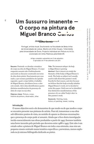 The immanent whisper: the body in Miguel Branco’s painting Abstract One’s intent is to study the thematic of the body at Miguel Branco’s work. The body as subject isn’t usually used to talk about this painter’s work. Exactly for that reason, and also because we believe that the body actually inhabits Miguel Branco’s work, we’ve decided to write this paper. Until now we’ve identified four distinctive manifestations of the presence of a so called ‘body’s idea’ in this painter’s work. Title
