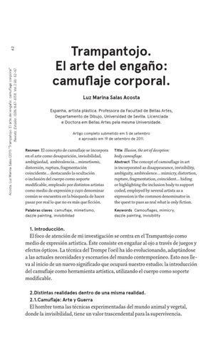 Trampantojo. El arte del engaño: camuflaje corporal. Luz Marina Salas Acosta Espanha, artista plástica. Professora da Facultad de Bellas Artes, Departamento de Dibujo, Universidad de Sevilla. Licenciada e Doctora em Bellas Artes pela mesma Universidade. Artigo completo submetido em 5 de setembro e aprovado em 19 de setembro de 2011.