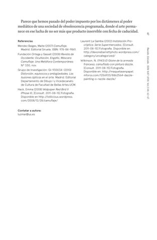 Fundación Ortega y Gasset (2008) Revista de Occidente: Ocultación, Engaño, Máscara Camuflaje. Una Metáfora Contemporánea. Nº 330, nov. Grupo de Investigación: GI-930034: (2010) Distorsión, equívocos y ambigüedades. Las ilusiones ópticas en el arte. Madrid: Editorial Departamento de Dibujo I y Vicedecanato de Cultura de Facultad de Bellas Artes.UCM. Hack, Emma (2008) Walpaper Red Bird II (Phase II), [Consult. 2011-08-15] Fotografia. Disponible en http://lolilicious.wordpress. com/2008/12/28/camuflaje/ Contatar a autora: luzmar@us.es