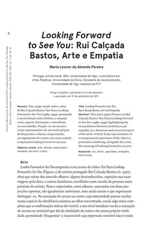 Looking Forward to See You: Rui Calçada Bastos, Arte e Empatia Maria Leonor de Almeida Pereira Portugal, artista visual. DEA, Universidade de Vigo; Licenciatura em Artes Plásticas, Universidade de Évora. Estudante de doutoramento, Universidade de Vigo, bolseira da FCT. Artigo completo submetido em 2 de setembro e aprovado em 19 de setembro de 2011.