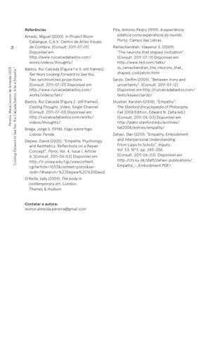 Referências Amado, Miguel (2000), in Project Room Catalogue, C.A.V. Centro de Artes Visuais de Coimbra. [Consult. 2011-07-01] Disponível em http://www.ruicalcadabastos.com/ works/videos/thoughts/ Bastos, Rui Calçada [Figura 1 e 3, still frames], Ten Years Looking Forward to See You. Two synchronized projections. [Consult. 2011‑07‑01] Disponível em http://www.ruicalcadabastos.com/ works/videos/ten/ Bastos, Rui Calçada [Figura 2, still frames], Casting Thoughs. Video, Single Channel. [Consult. 2011‑07‑01] Disponível em http://ruicalcadabastos.com/works/ videos/thoughts/ Braga, Jorge S. (1998), Fogo sobre fogo. Lisboa: Fenda. Depew, David (2005), “Empathy, Psychology, and Aesthetics: Reflections on a Repair Concept”, Poroi, Vol. 4, Issue I, Article 6. [Consult. 2011-06-03] Disponível em http://ir.uiowa.edu/cgi/viewcontent. cgi?article=1033&context=poroi&seiredir=1#search=%22Depew%2C%20David O’Reilly, Sally (2009), The body in contemporary art. London: Thames & Hudson.