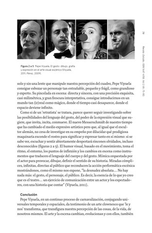 solo y sin una lente que manipule nuestra percepción del cuadro, Pepe Viyuela consigue esbozar un personaje tan entrañable, pequeño y frágil, como grandioso y experto. Su pincelada en escena: directa y sincera, con una precisión exquisita, casi milimétrica, y gran frescura interpretativa, consigue introducirnos en un mundo tan (ir)real como mágico, donde el tiempo casi desaparece, donde el espacio deviene infinito. Como si de un ‘retratista’ se tratara, parece querer seguir investigando sobre las posibilidades del lenguaje del gesto, del poder de la expresión visual que sugiere, que invita, incita, conmueve. El nuevo Messerschmidt de nuestro tiempo que ha cambiado el medio expresivo artístico pero que, al igual que el escultor alemán, no cesa de investigar en su empeño por dilucidar qué prodigiosa maquinaria esconde el rostro para significar y expresar tanto en sí mismo: si se sabe ver, escuchar y sentir abiertamente despertará rincones olvidados, incluso desconocidos (figuras 2 a 5). El humor visual, basado en el movimiento, toma el ritmo, el entorno, los puntos de inflexión y los cambios en escena como instrumentos que traducen el lenguaje del cuerpo y del gesto. Mímica orquestada por el actor para provocar, dibujar, definir el sentido de su historia. Miradas cómplices, infinitas, directas al público que reconducen la acción performática escénica mostrándonos, como él mismo nos expone, “la desnudez absoluta… No hay nada más: el gesto, el personaje, el público. Es decir, la esencia de lo que yo creo que es el teatro… un ejercicio de comunicación entre un actor y los espectadores, con una historia que contar” (Viyuela, 2011). Conclusión