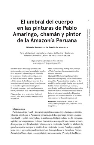 The threshold of the body in the paintings of Pablo Amaringo, chamán and painter of the Peruvian Amazonía Abstract Pablo Amaringo brings to the Peruvian contemporary art the vision of the man of the Amazonía about his place in the world. Its anthropological value is recognized, but his work is much more, is a unique, overflowing and frenetic aesthetic expression of the amazonian nature in which the human being is integrated organically. The article proposes and sustains the value of its vision and presence in the contemporary art.