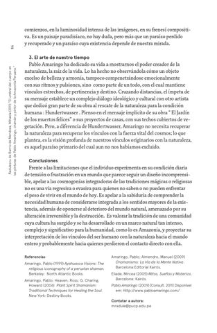 Amaringo, Pablo; Almendro, Manuel (2009) Chamanismo: La Via de la Mente Nativa. Barcelona:Editorial Kairós. Eliade, Mircea (2005) Mitos, Sueños y Misterios. Barcelona: Kairós. Pablo Amaringo (2009) [Consult. 2011] Disponível em: http://www.pabloamaringo.com/ Contatar a autora: mradule@pucp.edu.pe