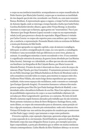o corpo na sua instância transitória: acompanhamos os corpos mumificados de Pedro Saraiva (por Maria João Gamito), corpos que se mostram na inutilidade do riso daquele que já não vive, recordando-nos Yorick, ou, com mais verosimilhança, Bentham. A representação aguça o engano, o trompe l’oeil do naturalismo de Antonio Agudo, onde se interroga o tempo fazendo a barba (por Isabel Sola). Carolina Rochefort devolve olhares, agora sobre Vivian Herzog: os desenhos mostram os corpos que os fizeram, agora gestos em “reservatórios.” Paco Lara-Barranco (por Sergio Romero Lopez) esconde o corpo na sua representação velada (ecrã) para provocar o desejo do espectador. Miguel Branco é visitado por Carlos Correia: os corpos são suportes para a sua antítese, que é a separação, a ausência, a representação. Fernanda Manéa visita no erotismo de Bellmer a ironia pós feminina de Kiki Smith. Os artigos agrupados no segundo capítulo, corpo: da máscara à camuflagem, debruçam-se sobre a ressignificação do corpo, ou o seu oposto, a camuflagem. O disfarce é uma necessidade vital que diferencia os seres vivos, plantas ou animais. A camuflagem mimetiza o inerte escondendo o vivo. O seu contrário é a significação ostensiva da ameaça, da guerra (tema abordado por Luz Marina Salas Acosta). Interroga-se a identidade, os olhos que nos são ora estranhos, ora familiares (as fotografias de Rui Calçada Bastos, por Maria Leonor de Almeida Pereira). O teatro do rosto é observado no clown, o actor do corpo e da máscara (Pepe Viyuela, por Ana Cremades). O xamanismo peruano é revisitado em Pablo Amaringo (por Mihaela Radulescu de Barrio de Mendoza) onde a selva amazónica esconde todos os corpos, para mostrar os espaços entre eles. Guillermo Pérez Villalta, não muito longe destas experiências que superam a realidade, visita novos espaços não euclidianos, onde o monstro se contempla (por Enrique Quevedo Aragón). Os monstros humanos e urbanos têm muito poucos segredos para Otto Dix (por Paula Santiago Martín de Madrid): a modernidade exibe a decadência brilhante do seu fim. Nino Cais explora o excesso de possibilidades expressivas do corpo e as suas inutilidades objetuais (observadas por Aline Langendonck): questiona-se a natureza. No texto de Jordi Morell a natureza engole homens alienados pelo trabalho que ela não inventou. Neste pretexto visitamos as obras de Steve McQueen e Santiago Sierra, onde, neste último, os corpos são remunerados para se alienarem, numa posição crítica e algo pós marxiana, e decerto pós estruturalista: onde está o homem vivo. Viviane Gil Araújo traz-nos notícias dos projetos de curadoria que aconteceram em São Paulo (1997 e 2005) e que tomaram o corpo como parâmetro. O terceiro capítulo, corpo: separação e hipercorpo, apresenta artigos que abordam o corpo separado de si, em transição. David Etxeberria apresenta Sergio Prego libertando corpo das suas obrigações físicas (o peso, por exemplo) para uma hiper corporalidade, a porta pós identitária que se reflete em muitas instâncias virtuais contemporâneas. Carlos Murilo da Silva Valadares debruça-se no novo