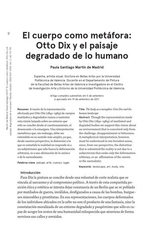 El cuerpo como metáfora: Otto Dix y el paisaje degradado de lo humano Paula Santiago Martín de Madrid Espanha, artista visual. Doctora en Bellas Artes por la Universidad Politécnica de Valencia. Docente en el Departamento de Pintura de la Facultad de Bellas Artes de Valencia e investigadora en el Centro de Investigación Arte y Entorno de la Universidad Politécnica de Valencia. Artigo completo submetido em 5 de setembro e aprovado em 19 de setembro de 2011.