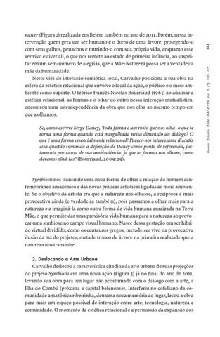 nascer (Figura 2) realizada em Belém também no ano de 2011. Porém, nessa intervenção quem gera um ser humano é o útero de uma árvore, protegendo-o com seus galhos, penachos e nutrindo-o com sua própria vida, enquanto esse ser vivo estiver ali, o que nos remete ao estado de primeira infância, ao suspeitar em um sem-número de alegrias, que a Mãe-Natureza possa ser a verdadeira mãe da humanidade. Neste viés de interação semiótica local, Carvalho posiciona a sua obra na esfera da estética relacional que envolve o local da ação, o público e o meio ambiente como suporte. O teórico francês Nicolas Bourriaud (1965) ao analisar a estética relacional, as formas e o olhar do outro nessa interação mutualística, encontrou uma interdependência da obra que nos olha ao mesmo tempo em que a olhamos.