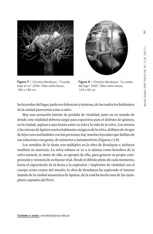 las leyendas del lugar, padecen dolencias y tristezas, de las cuales los habitantes de la ciudad parecerían estar a salvo. Hay una sensación latente de perdida de vitalidad, justo en en mundo de donde esta vitalidad debería surgir para esparcirse para el disfrute de quienes, en la ciudad, aspiran a una fusión entre su vida y la vida de la selva. Los sirenos y las sirenas de Iquitos son los habitantes mágicos de la selva, delfines de río que de lejos son confundidos con las personas; hay muchas leyendas que hablan de sus relaciones con gente, de misterios y metamorfosis (Figuras 7 y 8). Los sentidos de la fiesta son múltiples en la obra de Bendayan e incluyen también su ausencia. La selva urbana se ve a sí misma como heredera de la selva natural, se nutre de ella, se apropia de ella, para generar su propia comprensión y vivencia de su fuerza vital. Desde el difrute pleno de cada momento, hasta el espectáculo de la fiesta y la explosión / implosión de vitalidad con el cuerpo como centro del mundo, la obra de Bendayan ha explorado el intenso mundo de la ciudad amazónica de Iquitos, de la cual ha hecho una de las ejemplares capitales del Perú.