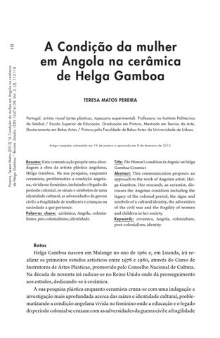dagem à obra da artista plástica angolana, Helga Gamboa. Na sua pesquisa, enquanto ceramista, problematiza a condição angolana, vivida no feminino, incluindo o legado do período colonial, os sinais e símbolos de uma identidade cultural, as adversidades da guerra civil e a fragilidade de mulheres e crianças na sociedade a que pertence. Palavras chave: cerâmica, Angola, colonialismo, pós-colonialismo, identidade.