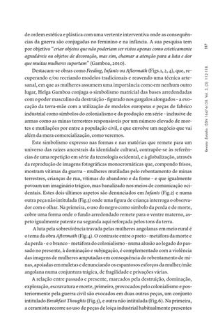 de ordem estética e plástica com uma vertente interventiva onde as consequências da guerra são conjugadas no feminino e na infância. A sua pesquisa tem por objetivo “criar objetos que não poderiam ser vistos apenas como esteticamente agradáveis ou objetos de decoração, mas sim, chamar a atenção para a luta e dor que muitas mulheres suportam” (Gamboa, 2010). Destacam-se obras como Feeding, Infants ou Aftermath (Figs.1, 2, 4), que, recuperando e/ou recriando modelos tradicionais e reavendo uma técnica artesanal, em que as mulheres assumem uma importância como em nenhum outro lugar, Helga Gamboa conjuga o simbolismo matricial das bases arredondadas com o poder masculino da destruição - figurado nos gargalos alongados – a evocação da terra-mãe com a utilização de modelos europeus e peças de fabrico industrial como símbolos do colonialismo e da produção em série – inclusive de armas como as minas terrestres responsáveis por um número elevado de mortes e mutilações por entre a população civil, e que envolve um negócio que vai além da mera comercialização, como veremos. Este simbolismo expresso nas formas e nas matérias que remete para um universo das raízes ancestrais da identidade cultural, contrapõe-se às referências de uma repetição em série da tecnologia ocidental, e à globalização, através da reprodução de imagens fotográficas monocromáticas que, compondo frisos, mostram vítimas da guerra – mulheres mutiladas pelo rebentamento de minas terrestres, crianças de rua, vítimas do abandono e da fome – e que igualmente povoam um imaginário trágico, mas banalizado nos meios de comunicação ocidentais. Estes dois últimos aspetos são denunciados em Infants (Fig.2) e numa outra peça não intitulada (Fig.3) onde uma figura de criança interroga o observador com o olhar. Na primeira, o uso do negro como símbolo da perda e de morte, cobre uma forma onde o fundo arredondado remete para o ventre materno, aspeto igualmente patente na segunda aqui reforçada pelos tons da terra. A luta pela sobrevivência travada pelas mulheres angolanas em meio rural é o tema da obra Aftermath (Fig.4). O contraste entre o preto – metáfora da morte e da perda - e o branco – metáfora do colonialismo - numa alusão ao legado do passado no presente, à dominação e subjugação, é complementado com a violência das imagens de mulheres amputadas em consequência do rebentamento de minas, apoiadas em muletas e denunciando os espantosos esforços da mulher/mãe angolana numa conjuntura trágica, de fragilidade e privações várias. A relação entre passado e presente, marcados pela destruição, dominação, exploração, escravatura e morte, primeiro, provocados pelo colonialismo e posteriormente pela guerra civil são evocados em duas outras peças, um conjunto intitulado Breakfast Thoughts (Fig.5), e outra não intitulada (Fig.6). Na primeira, a ceramista recorre ao uso de peças de loiça industrial habitualmente presentes