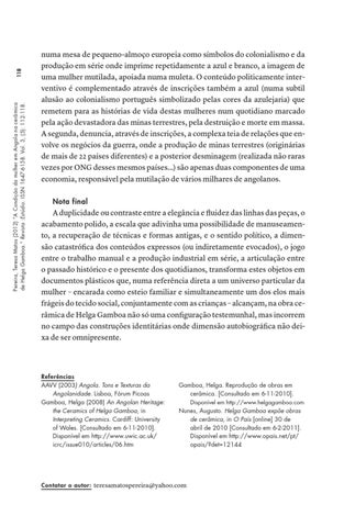 118 Pereira, Teresa Matos (2012) “A Condição da mulher em Angola na cerâmica de Helga Gamboa.” Revista :Estúdio. ISSN 1647-6158. Vol. 3, (5): 112-118.