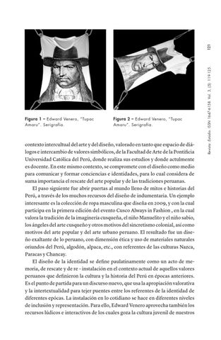 contexto intercultual del arte y del diseño, valorado en tanto que espacio de diálogos e intercambio de valores simbólicos, de la Facultad de Arte de la Pontificia Universidad Católica del Perú, donde realiza sus estudios y donde actulmente es docente. En este mismo contexto, se compromete con el diseño como medio para comunicar y formar conciencias e identidades, para lo cual considera de suma importancia el rescate del arte popular y de las tradiciones peruanas. El paso siguiente fue abrir puertas al mundo lleno de mitos e historias del Perú, a través de los muchos recursos del diseño de indumentaria. Un ejemplo interesante es la colección de ropa masculina que diseña en 2009, y con la cual participa en la primera edición del evento Cusco Always in Fashion , en la cual valora la tradición de la imaginería cusqueña, el niño Manuelito y el niño sabio, los ángeles del arte cusqueño y otros motivos del sincretismo colonial, así como motivos del arte popular y del arte urbano peruano. El resultado fue un diseño exaltante de lo peruano, con dimensión ética y uso de materiales naturales oriundos del Perú, algodón, alpaca, etc., con referentes de las culturas Nazca, Paracas y Chancay. El diseño de la identidad se define paulatinamente como un acto de memoria, de rescate y de re - instalación en el contexto actual de aquellos valores peruanos que definieron la cultura y la historia del Perú en épocas anteriores. Es el punto de partida para un discurso nuevo, que usa la apropiación valorativa y la intertextualidad para tejer puentes entre los referentes de la identidad de diferentes epócas. La instalación en lo cotidiano se hace en diferentes niveles de inclusión y representación. Para ello, Edward Venero aprovecha también los recursos lúdicos e interactivos de los cuales goza la cultura juvenil de nuestros