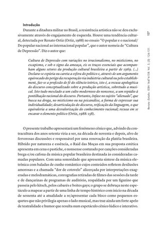 Durante a ditadura militar no Brasil, a resistência artística não se deu exclusivamente através do engajamento de esquerda. Houve uma tendência cultural, detectada por Renato Ortiz (Ortiz, 1988) no ensaio “O popular e o nacional/ Do popular nacional ao internacional popular”, que o autor nomeia de “Cultura de Depressão”. Diz o autor que: