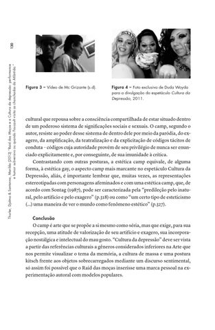 cultural que repousa sobre a consciência compartilhada de estar situado dentro de um poderoso sistema de significações sociais e sexuais. O camp, segundo o autor, resiste ao poder desse sistema de dentro dele por meio da paródia, do exagero, da amplificação, da teatralização e da explicitação de códigos tácitos de conduta – códigos cuja autoridade provém de seu privilégio de nunca ser enunciado explicitamente e, por conseguinte, de sua imunidade à crítica. Contrastando com outras posturas, a estética camp equivale, de alguma forma, à estética gay, o aspecto camp mais marcante no espetáculo Cultura da Depressão, aliás, é importante lembrar que, muitas vezes, as representações estereotipadas com personagens afeminados e com uma estética camp, que, de acordo com Sontag (1987), pode ser caracterizada pela “predileção pelo inatural, pelo artifício e pelo exagero” (p.318) ou como “um certo tipo de esteticismo (...) uma maneira de ver o mundo como fenômeno estético” (p.327). Conclusão