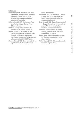 Referências Franco, Raul (2008) ‘Fico Assim Sem Você’ interpretado por Raul Franco. Gravação de mímica [Consult. 2011‑12-15] Acessível http://www.youtube.com/ watch?v=YqFygccDgRg Halperin, David (2007) San Foucault. Para uma hagiografia gay. Buenos Aires, Ediciones literales. Hutcheon, Linda (1985) Uma teoria da paródia. Rio de Janeiro: Edições 70. Marilac, Luiza (s.d.) Se isso é tá na pior... porrãn! q q quer dizer tá bem né? Vídeo [Consult. 2011‑12-15] Acessível em http://www.youtube.com/verify_age?next_ url=/watch%3Fv%3D9Gb3TWe6IcE. Marinho, Flávio (1983) Quem tem medo de um jogo teatral muito divertido? Jornal O