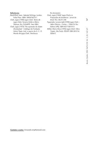 Rio de Janeiro. Clark, Lygia (1968) ‘Lygia Clark e a Proposição da Imanência.’ Jornal do Brasil. Rio: 06/01/68 Figueiredo, Luciano (ed) (1998) Lygia Clark – Hélio Oiticica – Cartas – 1964-74. Rio: Editora UFRJ. ISBN 85-71081913 Milliet, Maria Alice (1992) Lygia Clark: Obra Trajeto. São Paulo: EDUSP. ISBN 85-3140064-3