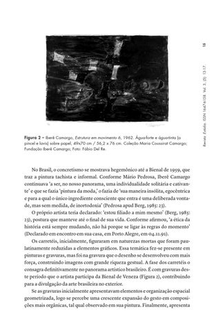 No Brasil, o concretismo se mostrava hegemônico até a Bienal de 1959, que traz a pintura tachista e informal. Conforme Mário Pedrosa, Iberê Camargo continuava ‘a ser, no nosso panorama, uma individualidade solitária e cativante’ e que se fazia ‘pintura da moda,’ o fazia de ‘sua maneira insólita, egocêntrica e para a qual o único ingrediente consciente que entra é uma deliberada vontade, mas sem medida, de inortodoxia’ (Pedrosa apud Berg, 1985: 23). O próprio artista teria declarado: ‘estou filiado a mim mesmo’ (Berg, 1985: 23), postura que manteve até o final de sua vida. Conforme afirmou, ‘a ética da história está sempre mudando, não há porque se ligar às regras do momento’ (Declarado em encontro em sua casa, em Porto Alegre, em 04.11.91). Os carretéis, inicialmente, figuraram em naturezas mortas que foram paulatinamente reduzidas a elementos gráficos. Essa temática fez-se presente em pinturas e gravuras, mas foi na gravura que o desenho se desenvolveu com mais força, construindo imagens com grande riqueza gestual. A fase dos carretéis o consagra definitivamente no panorama artístico brasileiro. É com gravuras deste período que o artista participa da Bienal de Veneza (Figura 2), contribuindo para a divulgação da arte brasileira no exterior. Se as gravuras inicialmente apresentavam elementos e organização espacial geometrizada, logo se percebe uma crescente expansão do gesto em composições mais orgânicas, tal qual observado em sua pintura. Finalmente, apresenta