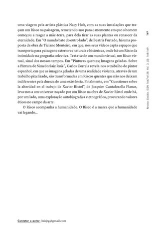 uma viagem pela artista plástica Nacy Holt, com as suas instalações que traçam um Risco na paisagem, remetendo-nos para o momento em que o homem começou a rasgar a mãe-terra, para dela tirar as suas plantas ou renascer da eternidade. Em “O mundo bate do outro lado”, de Beatriz Furtado, há uma proposta da obra de Ticiano Monteiro, em que, nos seus vídeos capta espaços que transporta para paisagens exteriores naturais e históricas, onde há um Risco da intimidade na geografia colectiva. Trata-se de um mundo virtual, um Risco virtual, sinal dos nossos tempos. Em “Pinturas quentes; Imagens geladas. Sobre a Pintura de Simeón Saiz Ruiz”, Carlos Correia revela-nos o trabalho do pintor espanhol, em que as imagens geladas de uma realidade violenta, através de um trabalho pixelizado, são transformadas em Riscos quentes que não nos deixam indiferentes pela dureza de uma existência. Finalmente, em “Cuestiones sobre la alteridad en el trabajo de Xavier Ristol”, de Joaquim Cantalozella Planas, leva-nos a um universo traçado por um Risco na obra de Xavier Ristol onde há, por um lado, uma exploração autobiográfica e etnográfica, procurando valores éticos no campo da arte. O Risco acompanha a humanidade. O Risco é a marca que a humanidade vai legando…
