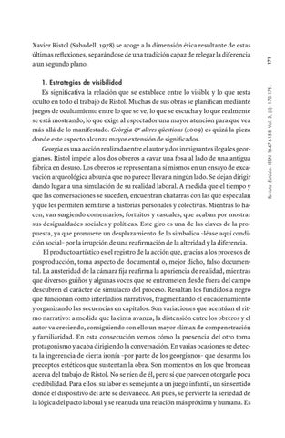 Es significativa la relación que se establece entre lo visible y lo que resta oculto en todo el trabajo de Ristol. Muchas de sus obras se planifican mediante juegos de ocultamiento entre lo que se ve, lo que se escucha y lo que realmente se está mostrando, lo que exige al espectador una mayor atención para que vea más allá de lo manifestado. Geòrgia & altres qüestions (2009) es quizá la pieza donde este aspecto alcanza mayor extensión de significados. Georgia es una acción realizada entre el autor y dos inmigrantes ilegales georgianos. Ristol impele a los dos obreros a cavar una fosa al lado de una antigua fábrica en desuso. Los obreros se representan a sí mismos en un ensayo de excavación arqueológica absurda que no parece llevar a ningún lado. Se dejan dirigir dando lugar a una simulación de su realidad laboral. A medida que el tiempo y que las conversaciones se suceden, encuentran chatarras con las que especulan y que les permiten remitirse a historias personales y colectivas. Mientras lo hacen, van surgiendo comentarios, fortuitos y casuales, que acaban por mostrar sus desigualdades sociales y políticas. Este giro es una de las claves de la propuesta, ya que promueve un desplazamiento de lo simbólico –léase aquí condición social– por la irrupción de una reafirmación de la alteridad y la diferencia. El producto artístico es el registro de la acción que, gracias a los procesos de posproducción, toma aspecto de documental o, mejor dicho, falso documental. La austeridad de la cámara fija reafirma la apariencia de realidad, mientras que diversos guiños y algunas voces que se entrometen desde fuera del campo descubren el carácter de simulacro del proceso. Resaltan los fundidos a negro que funcionan como interludios narrativos, fragmentando el encadenamiento y organizando las secuencias en capítulos. Son variaciones que acentúan el ritmo narrativo: a medida que la cinta avanza, la distensión entre los obreros y el autor va creciendo, consiguiendo con ello un mayor clímax de compenetración y familiaridad. En esta consecución vemos cómo la presencia del otro toma protagonismo y acaba dirigiendo la conversación. En varias ocasiones se detecta la ingerencia de cierta ironía –por parte de los georgianos– que desarma los preceptos estéticos que sustentan la obra. Son momentos en los que bromean acerca del trabajo de Ristol. No se ríen de él, pero sí que parecen otorgarle poca credibilidad. Para ellos, su labor es semejante a un juego infantil, un sinsentido donde el dispositivo del arte se desvanece. Así pues, se pervierte la seriedad de la lógica del pacto laboral y se reanuda una relación más próxima y humana. Es