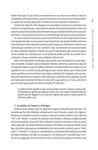 objeto hizo que lo que hasta ese momento no era sino un montón de huesos acumulados de manera más o menos fortuita se convirtiera en un enterramiento, pasara de ser una especie de muladar a ser un incipiente cementerio. Cientos de miles de años después, una eternidad, nosotros nos sentimos vinculados con aquellos que, depositando aquella herramienta de piedra entre sus muertos, dejaron una señal, demostrando su capacidad de simbolización, una cosmovisión, y una manera de sentirse en el mundo que nos parecen muy humanas. En este escrito me interesa remarcar este hecho, es decir, que desde nuestra concepción del arte reconocemos como tal el hacha de piedra hallado entre los restos humanos de la Sima de los Huesos de Atapuerca; reflexionar sobre la vinculación que sentimos con sus “autores”, hay ciertamente un reconocimiento en ellos; apuntar también el hecho de que la experiencia que tenemos aquí y ahora cuando nos enfrentamos a ese hacha de piedra puede ser similar esencialmente a la que sentimos ante cualquier obra de arte. Debo advertir desde el principio que puedo estar basándome en una hipótesis inestable, aunque la haya tomado de fuentes solventes, pues tiene algo de aventurado suponer que Excalibur (utilizaré esa denominación aunque no me agrade) no sea esa obra de arte primigenia que vemos ahora, que su ubicación entre aquellos muertos no fuera sino algo accidental. En cualquier caso, no tendría esto porqué llevar a que las reflexiones que a continuación expongo no sean acertadas pues pretendo hablar no tanto de lo que pudo ser el arte, sino de lo que es y de lo que puede ser. Decía Theodor W. Adorno: