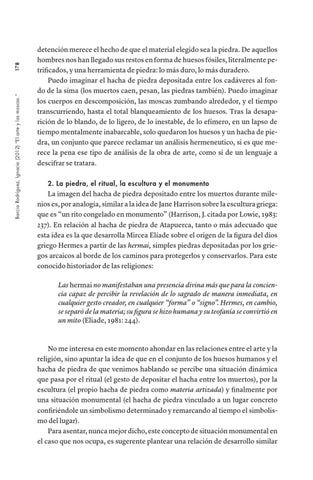 detención merece el hecho de que el material elegido sea la piedra. De aquellos hombres nos han llegado sus restos en forma de huesos fósiles, literalmente petrificados, y una herramienta de piedra: lo más duro, lo más duradero. Puedo imaginar el hacha de piedra depositada entre los cadáveres al fondo de la sima (los muertos caen, pesan, las piedras también). Puedo imaginar los cuerpos en descomposición, las moscas zumbando alrededor, y el tiempo transcurriendo, hasta el total blanqueamiento de los huesos. Tras la desaparición de lo blando, de lo ligero, de lo inestable, de lo efímero, en un lapso de tiempo mentalmente inabarcable, solo quedaron los huesos y un hacha de piedra, un conjunto que parece reclamar un análisis hermeneutico, si es que merece la pena ese tipo de análisis de la obra de arte, como si de un lenguaje a descifrar se tratara. 2. La piedra, el ritual, la escultura y el monumento