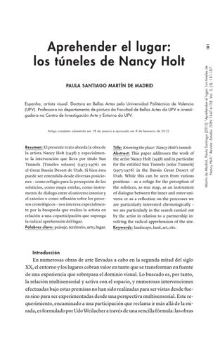 181 Martín de Madrid, Paula Santiago (2012) “Aprehender el lugar: los túneles de Nancy Holt.” Revista :Estúdio. ISSN 1647-6158. Vol. 3, (5): 181-187.