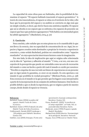 Referencias Bachelard, Gaston (2004) La poética del espacio. Madrid: Fondo de Cultura Económica, Bachelard, Gaston (1997) El derecho de soñar. Madrid: Fondo de Cultura Económica, Colafranceschi, Daniela (2007) Landscape + 100 palabras para habitarlo. Barcelona: Gustavo Gili. Galofaro, Luca (2003) Artscapes. El arte como