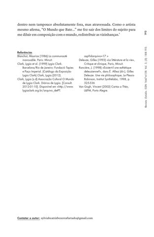 Referências Blanchot, Maurice (1986) La communauté inavouable. Paris: Minuit. Clark, Lygia et al. (1999) Lygia Clark. Barcelona/Rio de Janeiro: Fundació Tapies e Paço Imperial. (Catálogo da Exposição Lygia Clark).Clark, Lygia (2012). Clark, Lygia (s.d) Associação Cultural O Mundo de Lygia Clark. Diários de Lygia. [Consult. 2012‑01‑10]. Disponível em <http://www. lygiaclark.org.br/arquivo_detPT.