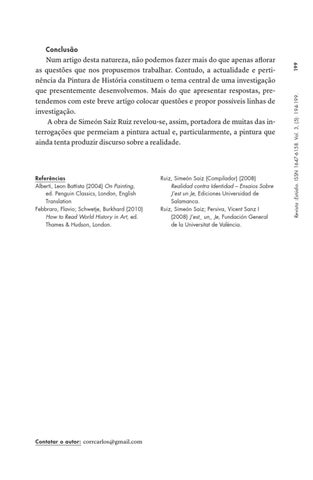 Num artigo desta natureza, não podemos fazer mais do que apenas aflorar as questões que nos propusemos trabalhar. Contudo, a actualidade e pertinência da Pintura de História constituem o tema central de uma investigação que presentemente desenvolvemos. Mais do que apresentar respostas, pretendemos com este breve artigo colocar questões e propor possíveis linhas de investigação. A obra de Simeón Saiz Ruiz revelou-se, assim, portadora de muitas das interrogações que permeiam a pintura actual e, particularmente, a pintura que ainda tenta produzir discurso sobre a realidade.